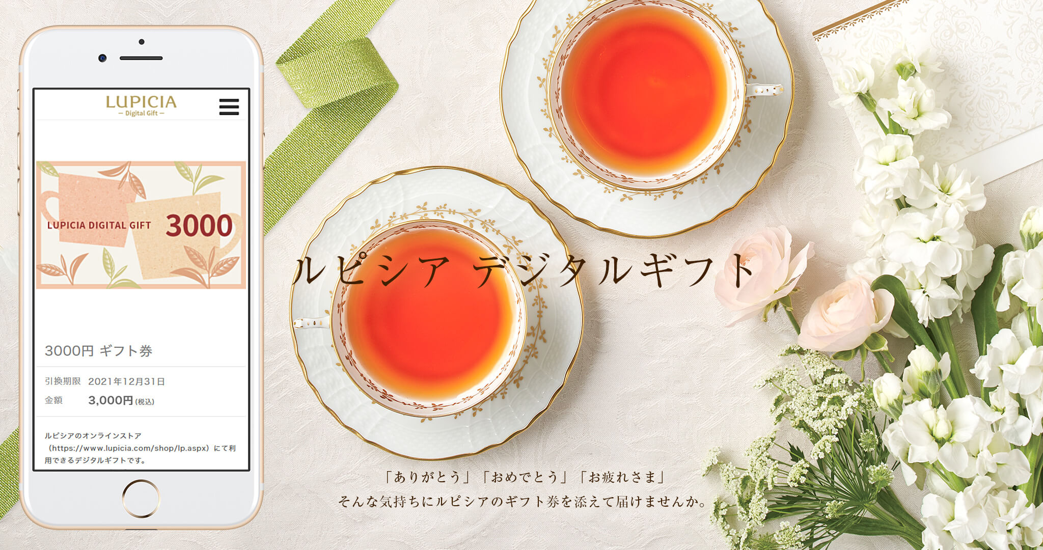 LUPICIA デジタルギフトとは、世界のお茶専門店ルピシアのオンラインストアで利用できるギフト券にメッセージを添えて贈ることのできるサービスです。